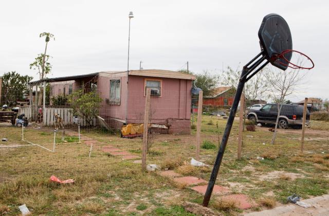 A basketball hoop stands at the edge of a trailer home's yard in Hidalgo County, Texas, in January. Around half a million Texans live in colonias – largely impoverished neighborhoods that fall outside of city limits and can lack basic public services. Image Credit: (MELANIE STETSON FREEMAN/CHRISTIAN SCIENCE MONITOR/GETTY IMAGES)